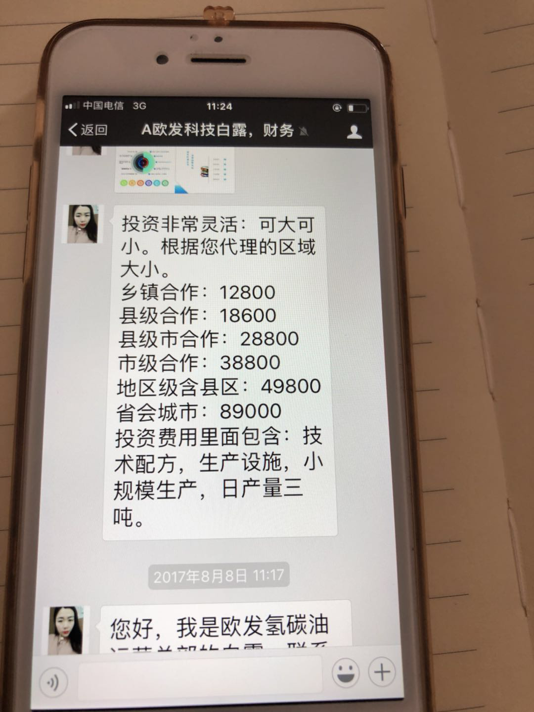 去年8月7日,湖南欧发环保科技有限公司一名自称白露的工作人员与肖先生的妻子吕女士取得了联系。白露在微信中向肖先生介绍说,“欧发氢碳油”是公司的第五代产品,新型独家研发而成的,面向全国来招合作代理商。“欧发氢碳油”与市面上的液化气相比具有产品生产成本低、安全性能比较高等4大投资优势,且投资非常灵活,可大可小。同时白露还告诉肖先生,双方合作成功,路费可以报销。