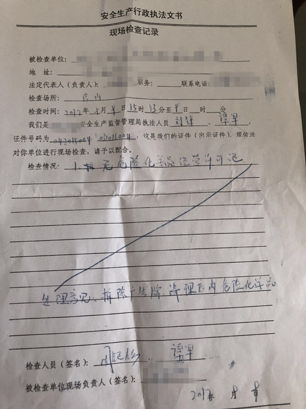 就在肖先生准备进行生产的时候,去年9月9日,当地安全生产监督管理局的一次例行检查让肖先生的一下从天上回到了地下,安监局工作人员进行告诉肖先生,因为这个“欧发氢碳油”的主要原产料是甲醛,所以必须要办理“危险化学品经营许可证“,否则是不允许生产的,要求肖先生拆除广告牌,清理店内危险化学品。
