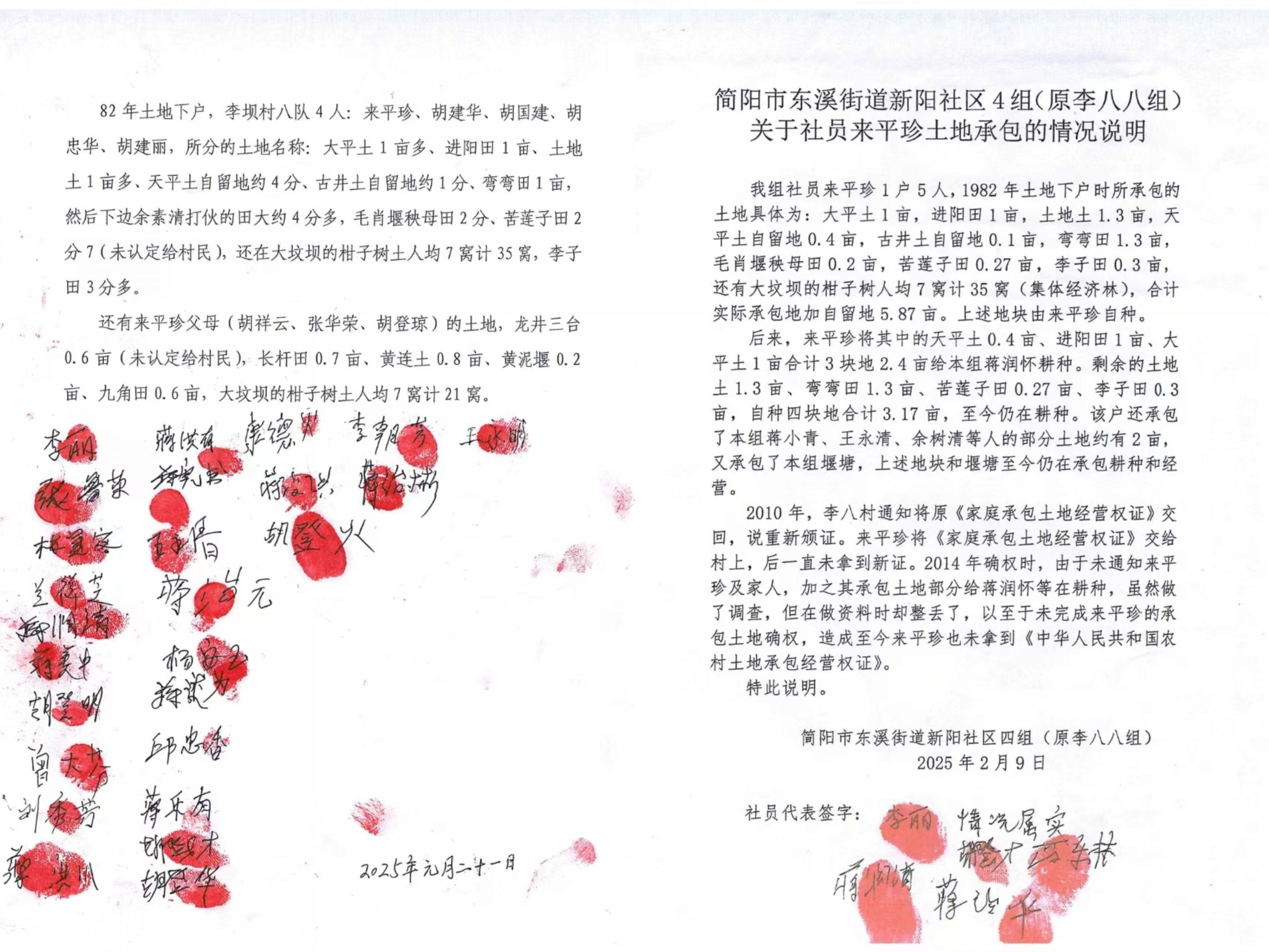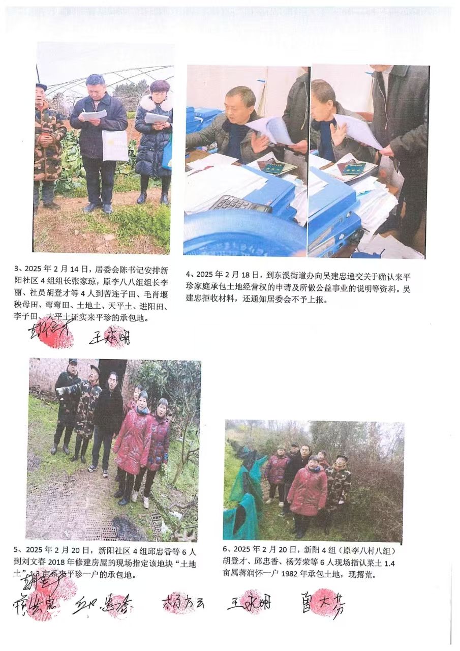 为进一步确认来平珍家承包土地的情况,今年2月14日,新阳社区书记陈道胜安排现新阳四组组长张家琼,组织原李八八组组长李丽、原李八八组会计王永明、社员代表胡某才等,到她家承包地块实地调查指认后,均已签名证实她家有地。