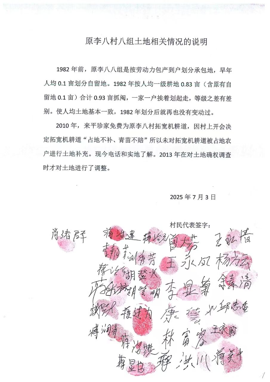 关于原李八村八组土地的相关情况,今年7月3日一份有数十位村民代表签字摁手印的说明材料显示,1982年前,原李八村八组是按劳动力包产到户划分承包地,早年人均0.13亩自留地。1982年按人均一级耕地0.83亩(加自留地0.1亩)合计0.93亩抓阄。1982年划分后再也没有变动过。2010年,来平珍家免费为原李八村拓宽机耕道,因村上开会决定拓宽机耕道“占地不补、青苗不赔”,所以未对拓宽机耕道被占地农户进行土地补充。直到2013年在整理土地资料时才对土地进行了调整。