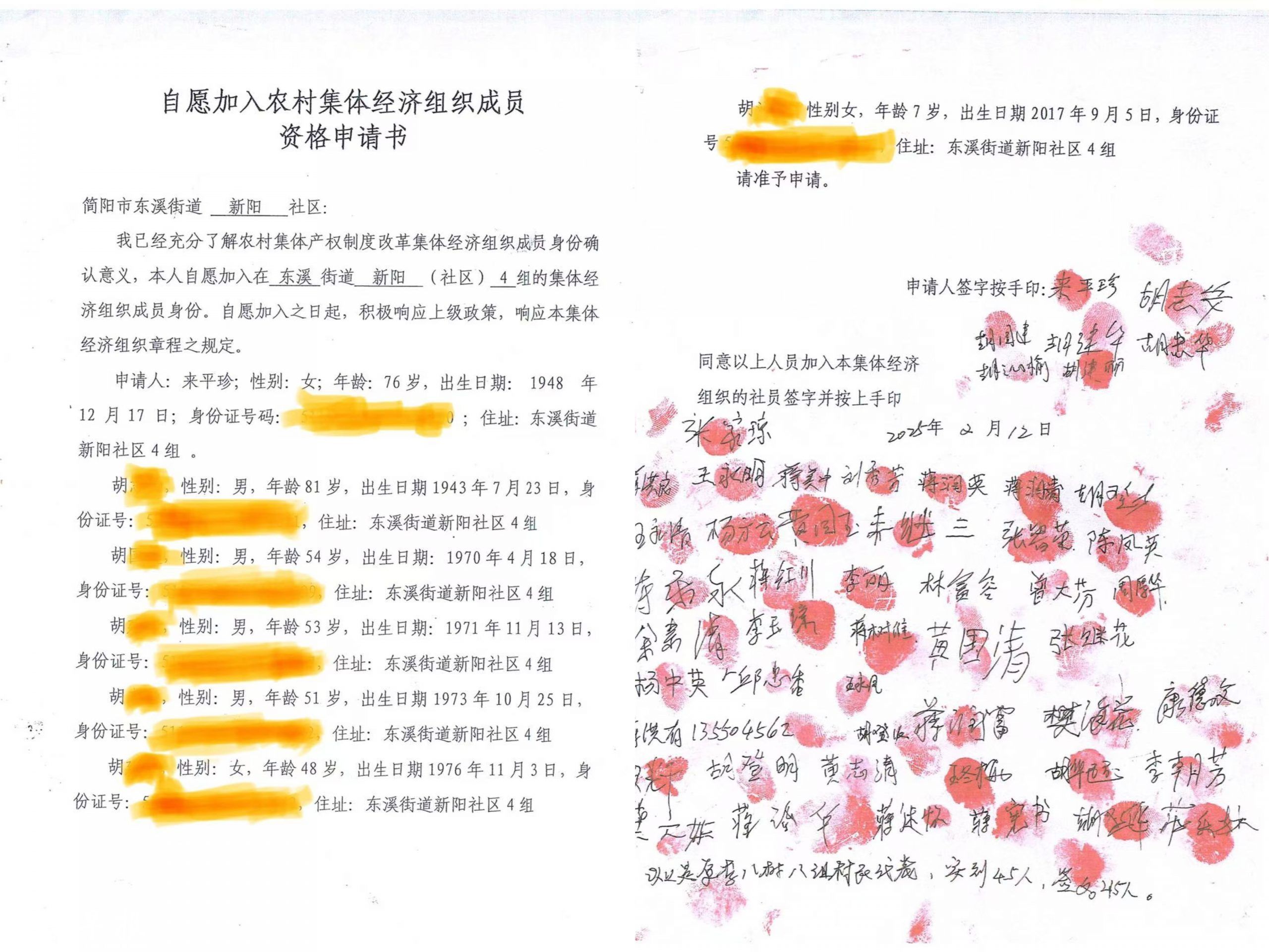 据来平珍介绍,早在2025年2月12日,她就按照四川省、成都市、简阳市相关规定,提出了加入集体经济组织的申请。接到申请后,2月16日,社区书记陈道胜安排新阳四组组长张家琼组织社员代表到社区会议室开会,社区书记陈道胜、社区主任兰国军等在会议室外听会。参会人员全体签字同意她家加入集体经济组织。