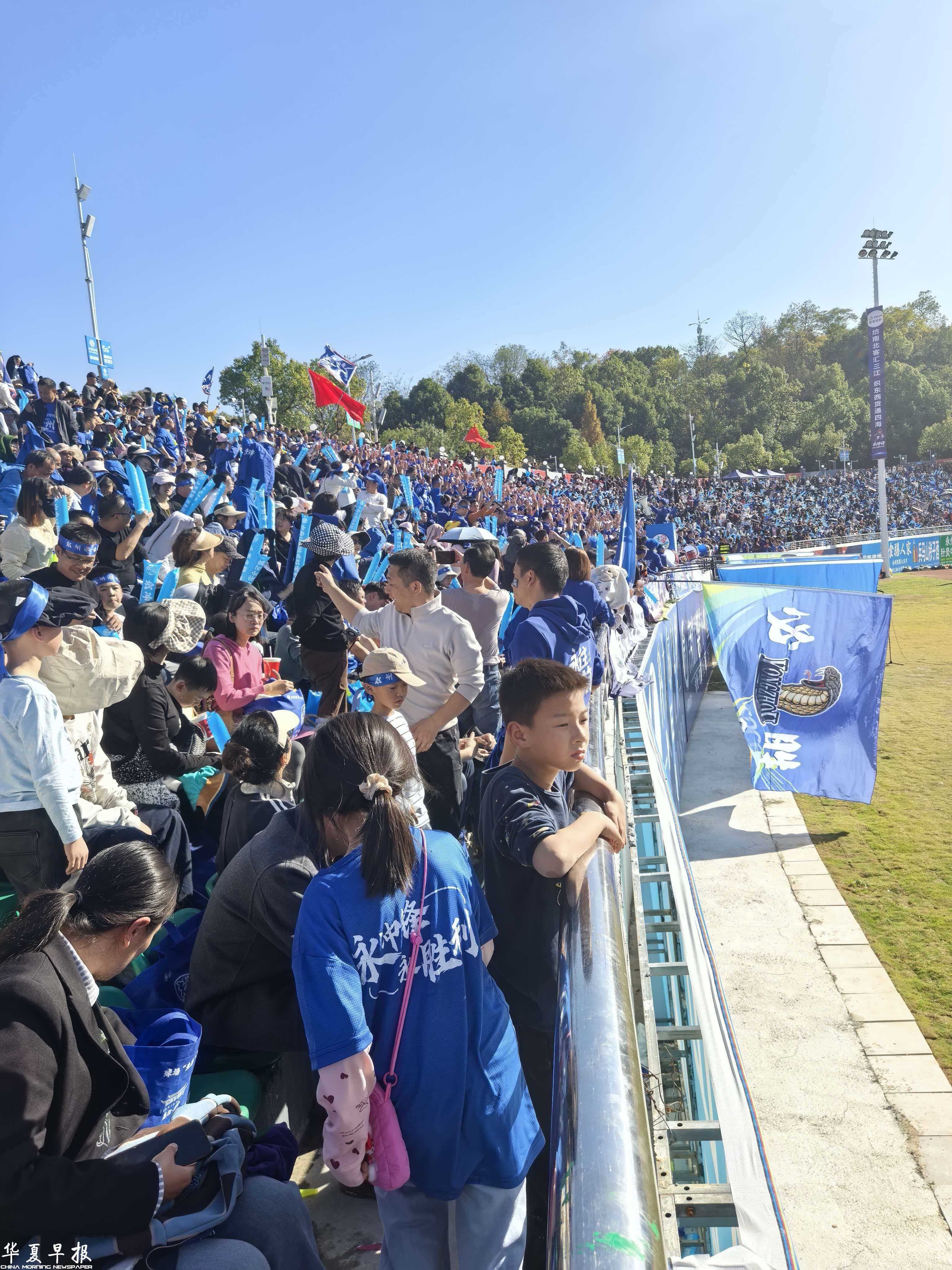 此前十场不败的永州队,经历三连败后跌至第五,仍顽强闯入八强。12月14日,关键战役在娄底打响。因客场票源有限,超三万名球迷汇聚永州体育中心“第二主场”,巨屏直播,声浪如潮,隔空助威。